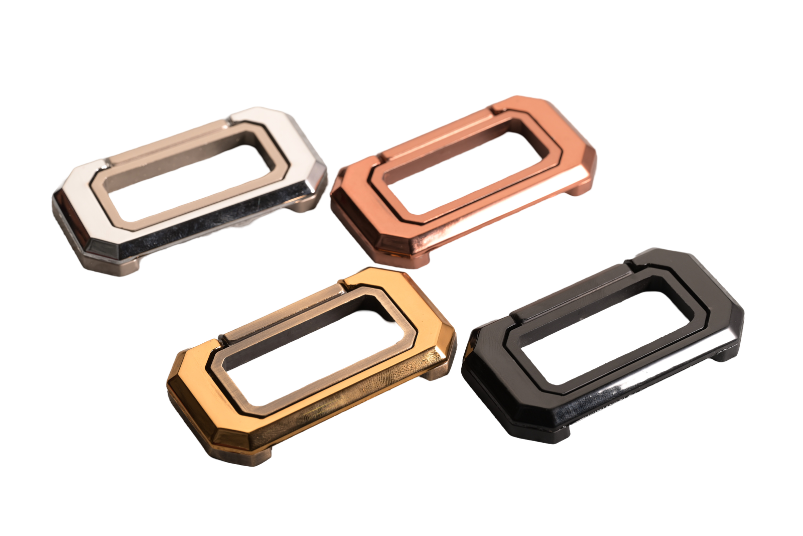 A sleek rectangular design for a modern aesthetic. Available in a variety of metallic finishes, this handle set adds sophistication to any furniture piece.